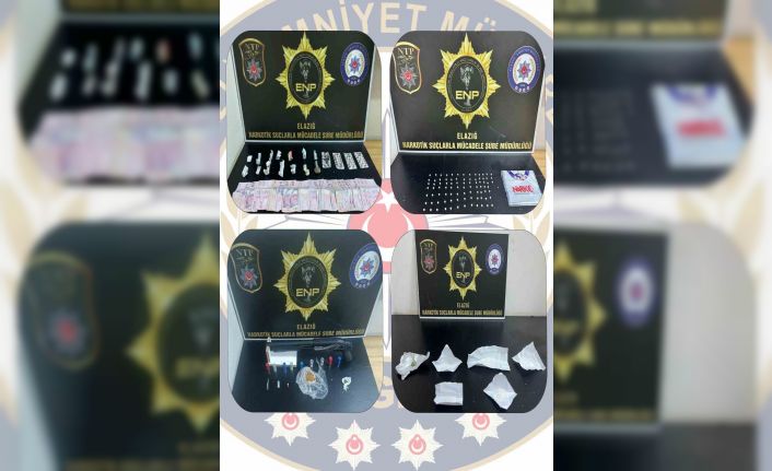 Elazığ Cumhuriyet Başsavcılığı koordinesinde İl Emniyet Müdürlüğü Narkotik Suçlarla Mücadele Şube Müdürlüğü tarafından, uyuşturucu ile mücadele kapsamında uyuşturucu madde kullanan şahıslara ve sokak satıcılarına yönelik çalışma gerçekleştirildi. Yapılan çalışmalarda, 20 parça halinde 31,23 gram esrar maddesi, 6 parça halinde 10,34 gram metamfetamin, 21,88 gram Kannobinoid maddesi, 158 adet sentetik ecza maddesi, 1 adet hassas terazi, 1 adet ruhsatsız pompalı tüfek ve 9 adet kartuş, uyuşturucu madde ticaretinden elde edildiği değerlendirilen 8 bin 400 lira ele geçirildi.