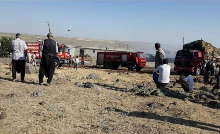 Şanlıurfa’nın Siverek ilçesinde elektrik tellerine temas eden saman yüklü kamyon alev alev yandı.