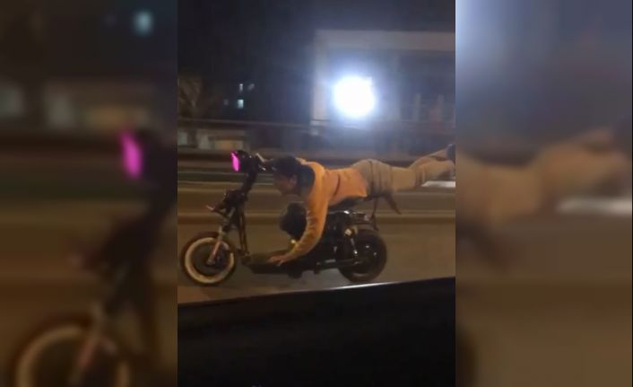 Dün akşam saatlerinde Muratpaşa ilçesi Gazi Bulvarı’nda elektrikli bisiklet üzerinde tehlikeli sürüş gerçekleştiren sürücüyü gören bir otomobil sürücüsü cep telefonuyla kayda girdi. Elektrikli bisikletin üzerine yatıp tek eliyle süren kasksız sürücü, direksiyonun altından baktığı yol güzergahında ilerlemeye uzun bir müddet devam etti. Kendisini görüntüleyen otomobil sürücüsünün ‘Kardeşim havalar nasıl? İyi misin’ sorusuna da, eliyle her şey yolunda işareti yaptı. Tehlikeli sürüşü kayda alan araçtakilerin de gülüşmeleri dikkat çekti. Sürücü bir süre sonra ise gözlerden kayboldu.