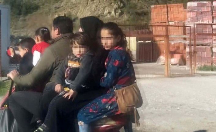 Görüntülerde, elektrikli bisiklet üzerinde ön tarafta iki çocuğun, arkada kadın ve kucağında küçük bir çocuk ile en arkada ise bir kız çocuğu ile ilerleyen baba, tehlikeye aldırış etmeden seyir etmesi görünüyor.