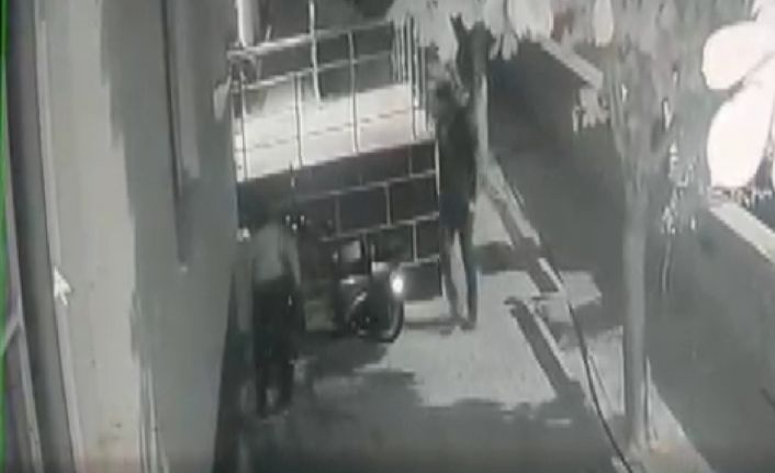 Konya’da bir binanın bahçesinde bulunan elektrikli motosikletin 2 hırsızlık şüphelisi tarafından çalınma anı güvenlik kamerası tarafından görüntülendi.