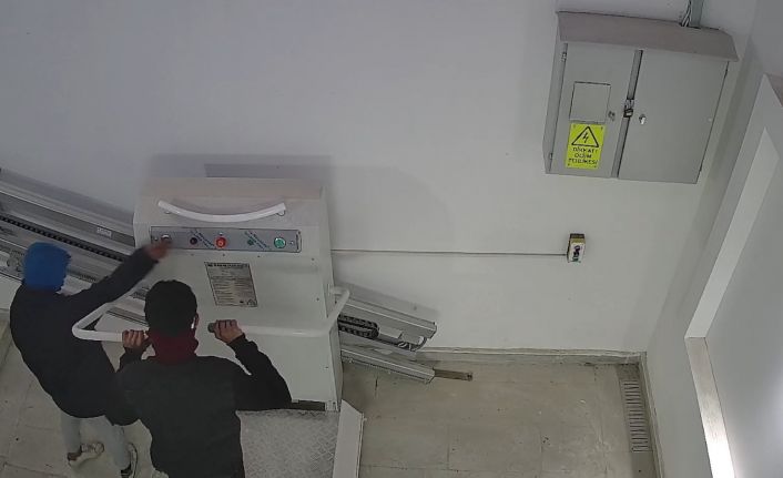 Kırıkkale’de kimliği belirsiz iki genç, engelliler ve yaşlılar için yapılan asansöre zarar verdi. O anlar güvenlik kamerasına yansıdı.