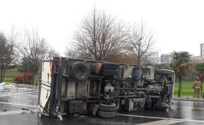 Kaza, Esenler Tem bağlantı yolu Mehmet Akif Ersoy Caddesi üzerinde meydana geldi. Edinilen bilgiye göre, Yalçın Kaya idaresindeki 34 KM 0634 plakalı gıda yüklü kamyon kaygan zeminde seyir halde ilerlerken virajı almayarak bariyerle çarparak yola devrildi. Kamyonun sürücü Yalçın Kaya ve yanında bulunan arkadaşı devrilen araçta mahsur kaldı. Çevredeki vatandaşlar mahsur kalan sürücü ve arkadaşını kurtarırken durumu polis ekiplerine bildirdi. İhbar üzerine olay yerine itfaiye ve polis ekipleri sevk edildi. Kaza sonra kamyonda büyük çaplı maddi hasar meydana geldi. Yolda bulunan bariyerlerde de maddi hasar meydana gelirken çarpma sonrası zarar gören kamyonun parçaları yola savruldu. Polis ekipleri bir süre caddeyi trafiğe kapattı. Kamyonun çekilmesinin ardından yol trafiğe tekrar açıldı.