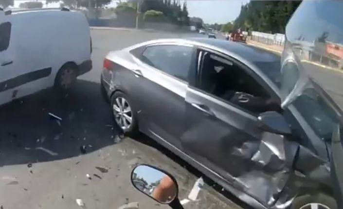 Antalya’da motosiklet sürücüsünün kavşakta çarpışıp üzerine doğru gelen otomobillerden eşiyle birlikte kurtulduğu anlar kask kamerasına yansıdı.