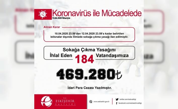Öte yandan 10-12 Nisan tarihleri arasında gerçekleşen sokağa çıkma yasağını ihlal eden 184 kişiye ise, Kabahatler Kanunu ve Umumi Hıfzıssıhha Kanunu 282’nci maddeye aykırı davranmaktan toplam 469 bin 280 TL idari para cezası uygulandı.