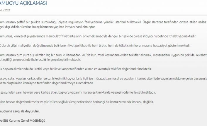 CHP milletvekili Özgür Karabat geçtiğimiz günlerde Et ve Süt kurumunda ithal edilen etlerle rant sağlandığını ve kurumun zarara uğratıldığını iddia etmişti. ESK, Karabat’ın iddialarını yalanlarken yapılan açıklamada, şu ifadelere yer verildi: