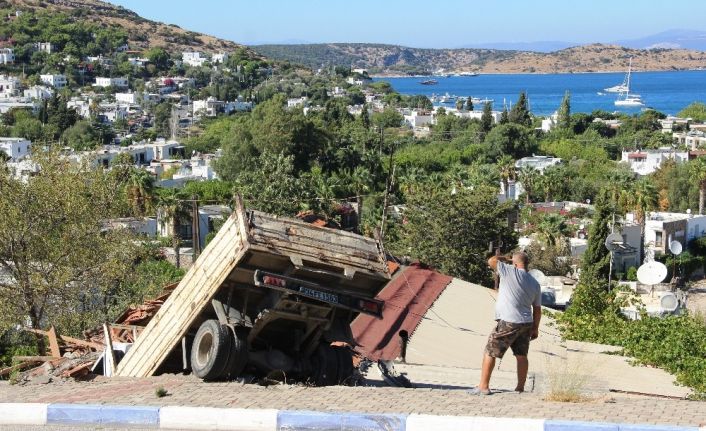 Muğla’nın Bodrum ilçesinden bir evin çatısından içeriye kamyonet girdi, 2 kişi yaralandı. Evinde torunuyla birlikte salça yapan yaşlı teyze ise evin içerisinde kamyonet görünce şoka girdi.
