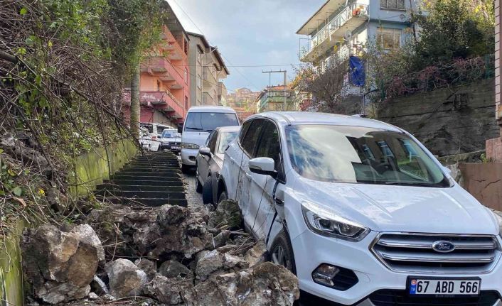 Zonguldak’ın Terakki Mahallesinde sağanak yağış ve fırtına nedeniyle meydana gelen heyelanda, park halindeki bir otomobilin üzerine kaya parçaları düştü. Kazada yaralanan olmadı.