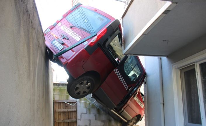Freni boşalan dolmuş taksi, bina boşluğunda asılı kaldı