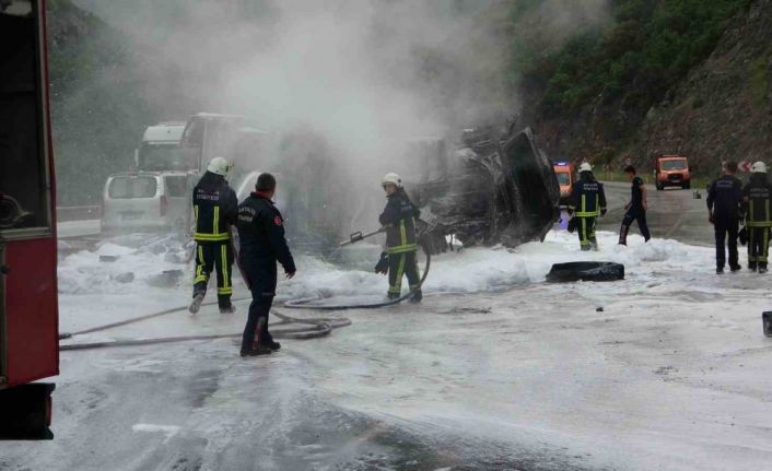 Facianın eşiğinden dönülen kaza Antalya Antalya Burdur karayolu Çubukbeli mevkiinde bu sabah saatlerinde yaşandı. Edinilen bilgiye göre Nihat Duman idarsindeki 34 ZJ 2517 plakalı boya ve tiner yüklü tırın freni patladı.Tırı kontrol edemeyen sürücü, aynı yönde seyreden Mehmet Badır idaresindeki 07 YBA 51 plakalı kamyonete arkadan çarptı. Çarpmanın ardından yan yatan tırda başlayan yangın 14 ton boya ve tinerlerin alev almasıyla birlikte alev topuna döndü. Kazada tır sürücüsü Nihat Duman ile kamyonette bulunun sürücü Mehmet Batır ile yolcular Haşim Şen ve Beşir yıldız kazayı hafif yaralı olarak atlatırken ihbar üzerine bölgeye çok sayıda sağlık ve itfaiye ekibi sevk edildi. Antalya Büyükşehir Belediyesi İtfaiyesi ekiplerinin köpükle yaptığı müdahale ile yaklaşık bir saatte söndürülen yangın sebebiyle Antalya Burdur karayolunda trafik kilitlendi. Siyah dumanların gökyüzünü kapladığı olayda itfaiye ekipleri soğutma çalışması yaptıktan sonra yol trafiğe yeniden açıldı.