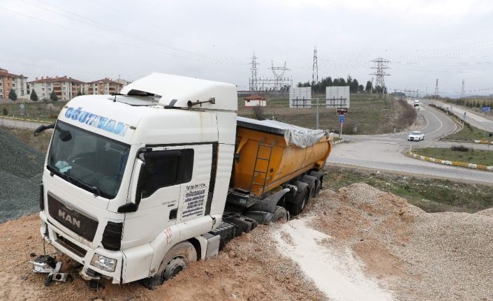 Tır, yol kenarında bulunan kum ve çakıllara saplanırken, 112 Acil Servis ve polis ekiplerine haber verildi.