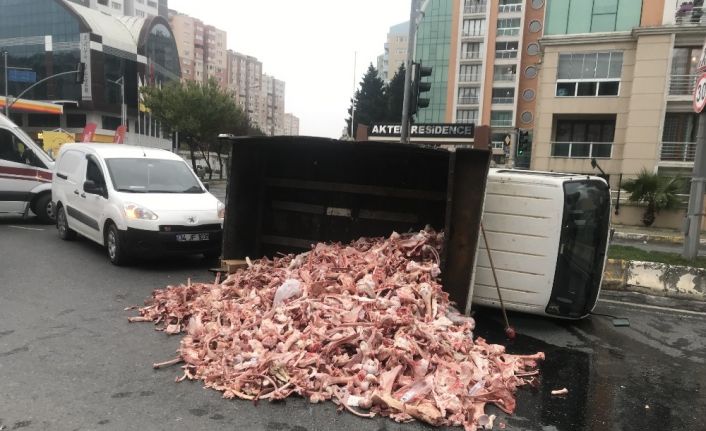 Büyükçekmece’de freni boşalan kemik yüklü kamyonet işlek caddede 300 metre kendi kendine hareket ettikten sonra önce bir araca ardından da refüje çarparak devrildi.