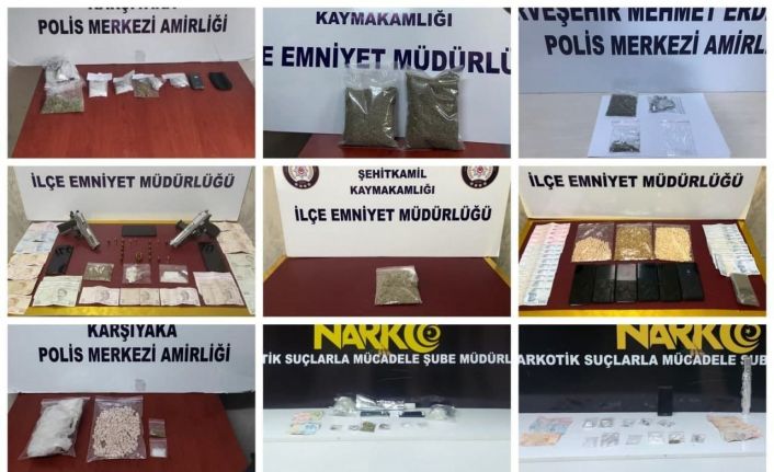 Gaziantep Emniyet Müdürlüğüne bağlı Narkotik Şube ekipleri, 4-10 Ekim tarihleri arasında yaptıkları operasyonlar sonucu uyuşturucu satıcısı olduğu tespit edilen 33 şüpheliyi gözaltına aldı. Yasal işlemlerinin ardından adli makamlara sevk edilen şüpheliler tutuklanarak cezaevine gönderildi. Ekipler şüphelilere ait adreslerde yaptıkları aramalarda 117 kilo 250 gram eroin, 1 kilo 687 gram bonzai, 630 gram esrar, 395 gram metamfetamin, 2 bin 381 adet uyuşturucu hap, 5 adet hassas terazi ele geçirdi.