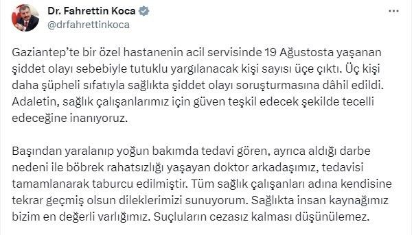 Bakan Koca, saldırıya uğrayan doktorun durumunu hakkında da bilgi vererek, "Başından yaralanıp yoğun bakımda tedavi gören, ayrıca aldığı darbe nedeni ile böbrek rahatsızlığı yaşayan doktor arkadaşımız, tedavisi tamamlanarak taburcu edilmiştir. Tüm sağlık çalışanları adına kendisine tekrar geçmiş olsun dileklerimizi sunuyorum. Sağlıkta insan kaynağımız bizim en değerli varlığımız. Suçluların cezasız kalması düşünülemez" dedi.