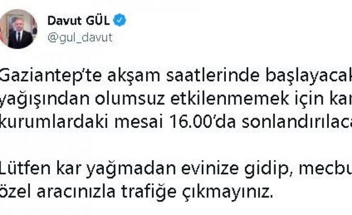 Akşam saatlerine doğru yoğun kar yağışı beklendiğini açıklayan Gaziantep Valisi Davut Gül, "Gaziantep’te akşam saatlerinde başlayacak yoğun kar yağışından olumsuz etkilenmemek için kamu kurumlardaki mesai 16.00’da sonlandırılacaktır. Lütfen kar yağmadan evinize gidip, mecbur olmadıkça özel aracınızla trafiğe çıkmayınız" ifadelerini kullandı.