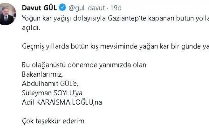 Konu ile ilgili sosyal medya hesabından açıklama yapan Gaziantep Valisi Davut Gül, "Yoğun kar yağışı dolayısıyla Gaziantep’te kapanan bütün yollarımız trafiğe açıldı. Geçmiş yıllarda bütün kış mevsiminde yağan kar, bir günde yağdı. Bu olağanüstü dönemde yanımızda olan bakanlarımız Abdulhamit Gül’e, Süleyman Soylu’ya ve Adil Karaismailoğlu’na çok teşekkür ederim" ifadelerini kullandı.