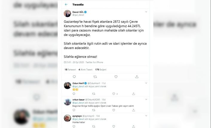 Gaziantep Valisi Davut Gül, sosyal medyadan yaptığı açıklamada, "Gaziantep’te havai fişek atanlara 2872 sayılı Çevre Kanunu’nun H bendine göre uyguladığımız 44 bin 245 TL idari para cezasını meskun mahalde silah sıkanlar için de uygulayacağız. Silah sıkanlarla ilgili rutin adli ve idari işlemler de ayrıca devam edecektir. Silahla eğlence olmaz" ifadelerini kullandı.