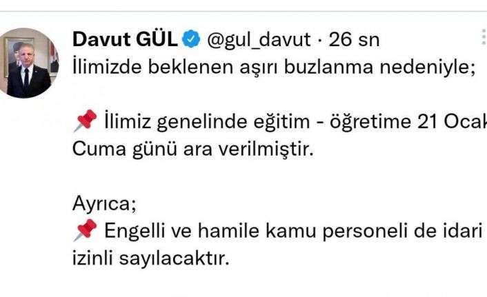 Vali Gül, sosyal medya hesabından yaptığı açıklamada, "İlimizde beklenen aşırı buzlanma nedeniyle ilimiz genelinde eğitim - öğretime 21 Ocak Cuma günü ara verilmiştir. Ayrıca, engelli ve hamile kamu personeli de idari izinli sayılacaktır. İyi tatiller" ifadelerine yer verildi.