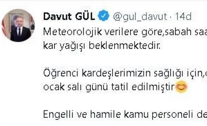 Paylaşımında meteorolojik verilere göre, sabah saatlerinden itibaren Gaziantep’te yoğun kar yağışı beklendiğini hatırlatan Vali Gül, “Öğrenci kardeşlerimizin sağlığı için, okullar ve rehabilitasyon merkezleri 18 ocak salı günü tatil edilmiştir. Engelli ve hamile kamu personeli de idari izinli sayılacaktır” ifadelerini kullandı.