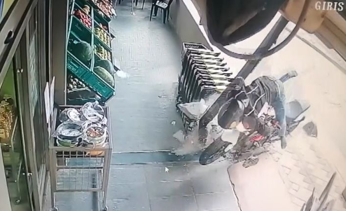 Kaza anı anbean iş yerinin güvenlik kamerasına yansıdı. Güvenlik kamerasında hızla gelen sürücünün virajı alamayarak kaldırımın üstüne çıktığı, metal direğe, ardından da takla atarak alışveriş merkezine daldığı anlar görülüyor. Ayrıca alışveriş merkezine giren bir müşterinin saniyelerle ezilmekten son anda kurtulduğu da görüntülere yansıdı.