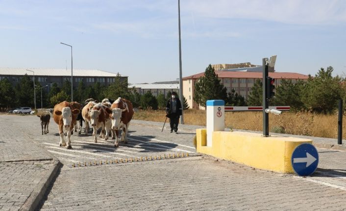Kurtların saldırısı nedeniyle ana sürüden ayrılarak yollarını kaybedince üniversite yerleşkesine giren ve gece burada misafir edilen 18 büyükbaş hayvan sahibine teslim edildi.