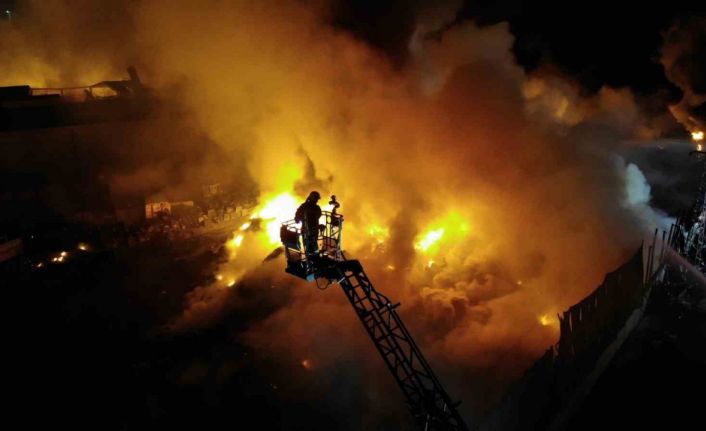 Manisa’nın Yunusemre ilçesindeki geri dönüşüm tesisindeki yangın devam ediyor. 5,5 saattir aralıksız müdahale edilen yangında ekiplerin çalışmaları havadan görüntülendi.
