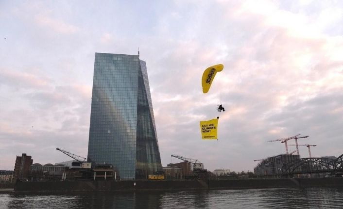 Çevre grubu Greenpeace aktivistleri, fosil yakıt protestoları kapsamında Almanya’nın Frankfurt kentinde bulunan Avrupa Merkez Bankası’nın (ECB) çatısına paraşütle indi. ECB’nin fosil yakıt üreten firmalarla olan bağlantılarını protesto eden aktivistler, “İklim katillerine fon sağlamayı durdur” yazılı pankart açtı.