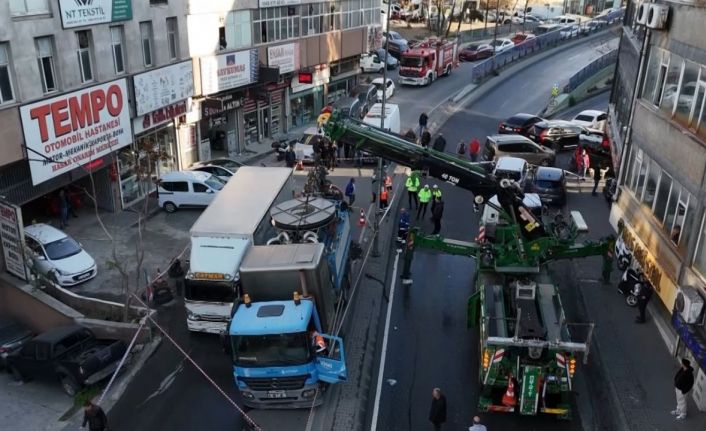 İstanbul Güngören’de İSKİ ekiplerine gelen şikayet üzerine gittiği cadde üzerinde yapılan çalışma esnada meydana gelen çökme sonucu 2 kamyon çukura düştü. Ekiplerin oluşan çukura düşen kamyonları çıkarma çalışmaları dron ile görüntülenirken, çökme sonucu kamyonun oluşan çukura düştüğü anlar güvenlik kamerasına yansıdı.