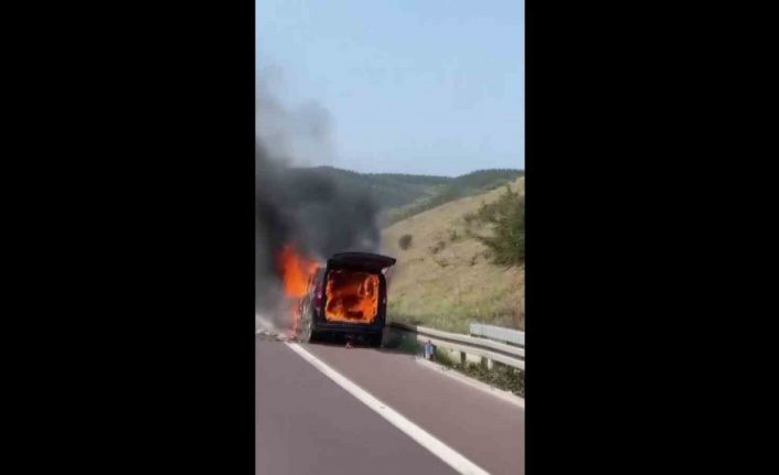Bursa-İstanbul otobanında alev alev yanan hafif ticari araç paniğe sebep oldu. O anlar diğer sürücülerin kameralarına yansıdı.