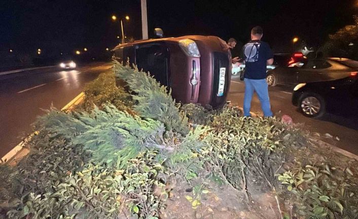Düzce’de hafif ticari araç refüje çıkarak devrildi. Kazada şans eseri kimse yaralanmazken yolda uzun araç kuyruğu oluştu.