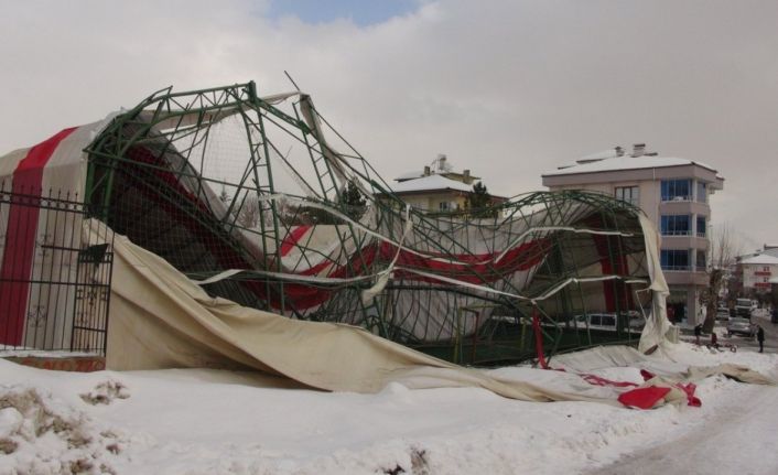 Malatya’nın Doğanşehir ilçesinde kar kütlesinin ağırlığına dayanamayan halı sahasının çatısı çöktü. Çatısı çöken halı sahada maç oynama hazırlığı yapıldığı, vatandaşlar halı sahaya girmeden hemen önce çatının çöktüğü ve muhtemel büyük bir facianın eşiğinden dönüldüğü ortaya çıktı.