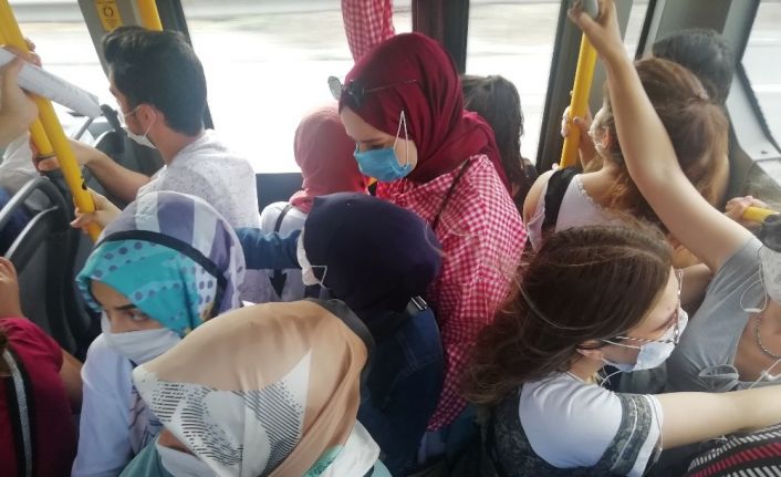 Kocaeli’de Dikey Geçiş Sınavı (DGS) olması sebebiyle sabahın erken saatlerinde otobüslerde yoğunluk oluştu. Pandemi kuralları sebebiyle otobüs kooperatifi erken önlem almayınca, nefes alacak yer kalmadı. Vatandaşlar otobüs şoförüne sosyal mesafeyi korumadığı için tepki gösterdi.