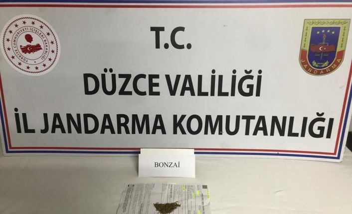 Düzce’de uyuşturucu ile mücadele devam ediyor. Jandarma Komutanlığı’na bağlı ekiplerin devam ettirdiği mücadele çalışmaları kapsamında Melen su park ve Gümüşova’da yol kontrolleri yapıldı. Yapılan kontrollerde hassas köpekler uyuşturucuya geçit vermedi. Bu kapsamda Mamure Köyü Melen su parkında yol kontrol faaliyeti esnasında şüphe üzerine durdurulan araç içerisinde B. K. ve Y. B. isimli şahısların narkotik uyuşturucu köpeğinin tepki vermesi üzerine B. K. isimli şahsın üzerinde bulunan yaklaşık 5 gram Bonzai isimli uyuşturucu maddesi ele geçirildi.