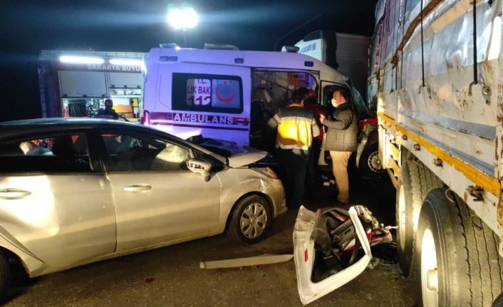 Sakarya D-100 Karayolu’nda hasta taşıyan ambulans, tır ve otomobilin karıştığı kazada 2’si ağır 8 kişi yaralandı.