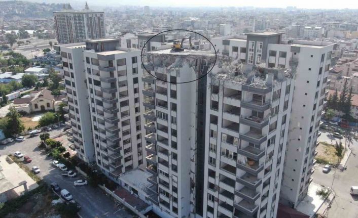 Depremin vurduğu Hatay’da 13 katlı lüks site, tepesine iş makinesi çıkarılarak yıkılmaya başlandı. Bina tepesindeki iş makinası, vatandaşların da ilgi odağı oldu.