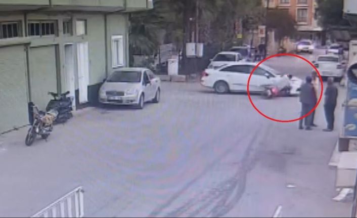 Hatay’ın Reyhanlı ilçesinde motosiklet ile otomobilin çarpıştığı anlar bir işyerinin güvenlik kamerasına yansıdı.