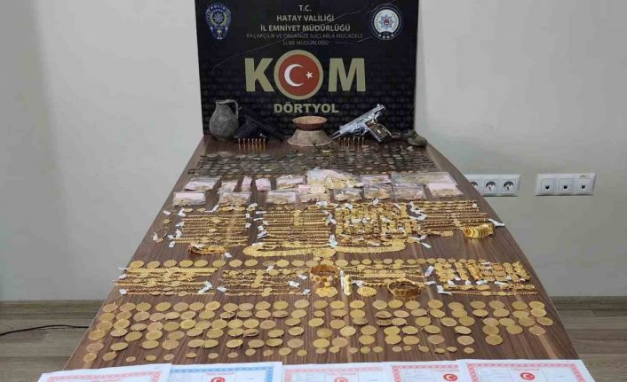 Hatay’ın Dörtyol ilçesinde polis ekipleri tarafından kuyumculara gerçekleştirilen operasyonda çok sayıda standartlara uygun olmayan sahte altın ve Roma, Bizans ve İslami dönemlere ait sikke ile obje ele geçirildi.