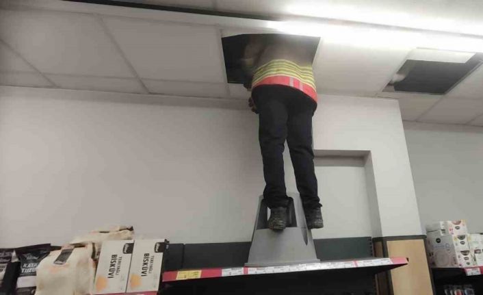 Hatay’da marketin havalandırma boşluğunda mahsur kalan kedi itfaiye ekiplerince kurtarıldı.