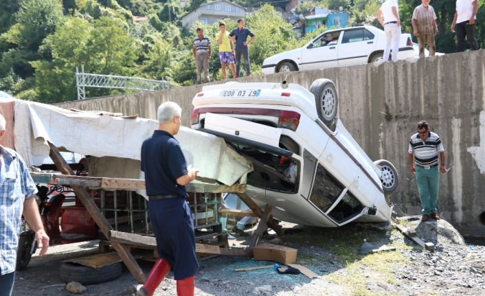 Zonguldak’ta kontrolden çıkan otomobil, yaklaşık 3 metrelik duvardan aşağıya uçarak ters döndü. Motosiklet garajının üzerine düşmeleri sayesinde kazadan ucuz kurtulan araçtaki 2 kişi yaralandı.