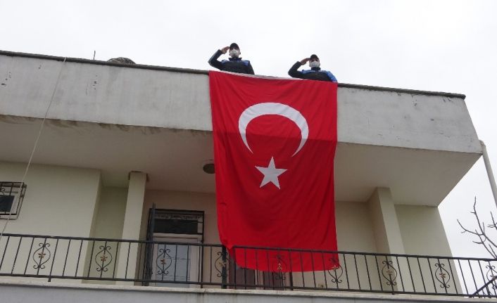 Suriye’nin İdlib bölgesinde sözleşmeli er olarak görev yapan Ramazan Erdoğan, Adıyaman İl Emniyet Müdürlüğüne ulaşarak Adıyaman merkez Karapınar Mahallesi’nde bulunan evlerine Türk bayrağı asılmasını istedi. 3 yıldır sözleşmeli er olarak görev Ramazan Erdoğan’ın isteği üzerine harekete geçen Adıyaman İl Emniyet Müdürlüğüne bağlı Toplum Destekli Şube Müdürlüğü ekipleri, 3 metre boyundaki Türk bayrağını Erdoğan’ın evine götürdü. Polis ekipleri Türk bayrağını Ramazan Erdoğan’ın annesi Üveys Erdoğan’a teslim etti. Polis ekipleri teslim ettikleri bayrağı Erdoğan Ailesi ile birlikte eve asarak dalgalandırdı.