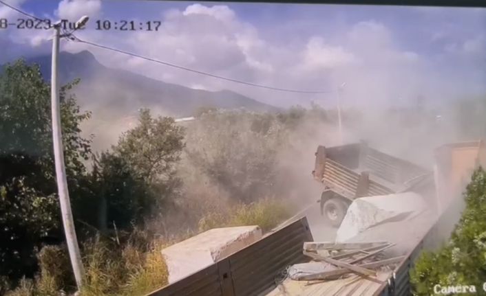 Bursa’nın Orhangazi ilçesinde iki kişinin ağır yaralandığı kamyon ile mermer yüklü tırın çarpışması anbean kameraya yansıdı.