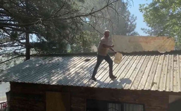 Bursa’nın Kestel ilçesinde inekleriyle belediyeyi basan kişinin hazine arazisine kaçak yaptığı 2 katlı bina ve ahır yıkıldı. İnekleriyle eylem yapıp belediyeyi basan ve görevliyi tokatlayan Ü.Y. yıkım günü çatıya çıkıp kendini yakmak istedi. Yıkıma gelen ekiplere saldıran Ü.Y. ile eşinin görevli avukata tokat attığı anlar da kameraya yansıdı.