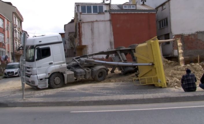 Arnavutköy’de bir inşaattan hafriyat almaya gelen kamyon, devrildi. Olay nedeniyle cadde trafiğe kapatıldı.