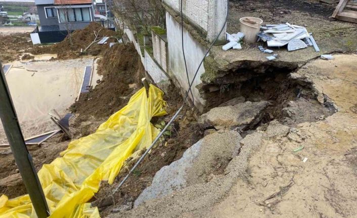 Kocaeli’nin İzmit ilçesinde inşaat çalışması sırasında meydana gelen toprak kayması nedeniyle yolun bir bölümü çökerken, bir binanın istinat duvarı yıkılarak otoparkı hasar gördü.