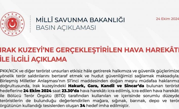 Milli Savunma Bakanlığından yapılan açıklamada, “PKK/KCK ve diğer terörist unsurları etkisiz hale getirerek halkımıza ve güvenlik güçlerimize yönelik terör saldırılarını bertaraf etmek ve hudut güvenliğimizi sağlamak maksadıyla; Birleşmiş Milletler Anlaşması’nın 51’inci maddesinden doğan meşru müdafaa haklarımız doğrultusunda, Irak kuzeyindeki Hakurk, Gara, Kandil ve Sincar’da bulunan terörist hedeflerine 24 Ekim 2024 saat 23.30’da hava harekatı icra edilmiş, icra edilen hava harekatı ile Bölücü Terör Örgütü (BTÖ) tarafından kullanılan ve içerisinde sorumlu düzeyde teröristlerin de bulunduğu değerlendirilen mağara, sığınak, barınak, depo ve terör örgütünün kullandığı tesislerden oluşan 34 hedef imha edilmiştir” ifadelerine yer verildi. Terörle mücadelede kararlılık vurgusu yapılan açıklamada, “İcra edilen harekatta azami oranda yerli ve milli mühimmat kullanılarak çok sayıda terörist etkisiz hale getirilmiştir. Asil milletimizin bağrından çıkan Türk Silahlı Kuvvetleri, geçmişte olduğu gibi bugün de ülkemizin ve milletimizin beka ve güvenliği için terörle mücadeleye tek bir terörist kalmayıncaya kadar azim ve kararlılıkla devam edecektir. Bu harekatlar sırasında; masum sivillerin, dost unsurların, tarihî ve kültürel varlıklar ile çevrenin zarar görmemesi için her türlü tedbir alınmıştır” denildi.