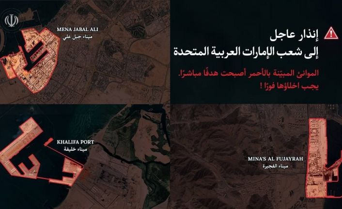 ABD-İsrail ile İran arasındaki şiddetli çatışmalar devam ederken İran Devrim Muhafızları Ordusu (DMO), Birleşik Arap Emirlikleri’nin (BAE) başkenti Abu Dabi ve Dubai kentindeki limanlar için tahliye uyarıları yayımladı. Açıklamada, başkent Abu Dabi’deki Khalifa Limanı, Dubai’deki Jebel Ali Limanı ve Fujairah Limanı yakınlarındaki sivil halka ve liman çalışanlarına derhal bölgeyi terk etme çağrısında bulunuldu. Söz konusu bölgelerin sivil yerleşim yerleri yakınlarında bulunan ABD askeri varlığı nedeniyle meşru hedefler haline geldiği ve gelecek saatlerde hedef alınabileceği belirtildi. Uyarı metnine eşlik eden görselde, hedef alınabileceği belirtilen limanlara ilişkin harita detayları da paylaşıldı.