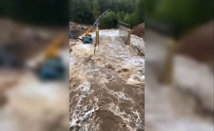 Bölgede yol ve köprü çalışması yaptığı öne sürülen bir vincin sular içerisinde kaldığı anlar bir vatandaşın cep telefonu kamerası tarafından saniye saniye kayıt altına alındı. Yağışla birlikte tüm ekipler yağışın vurduğu bölgeye seferber edildi.