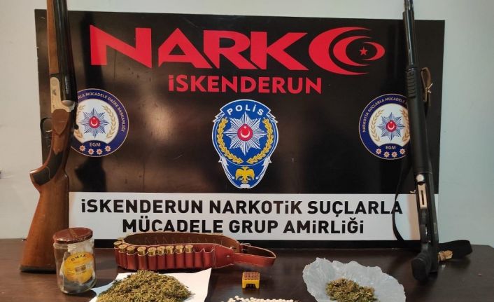 Hatay’ın İskenderun ilçesinde düzenlenen uyuşturucu operasyonlarında çok sayıda uyuşturucu hap, esrar ve pompalı tüfek ele geçirildi.