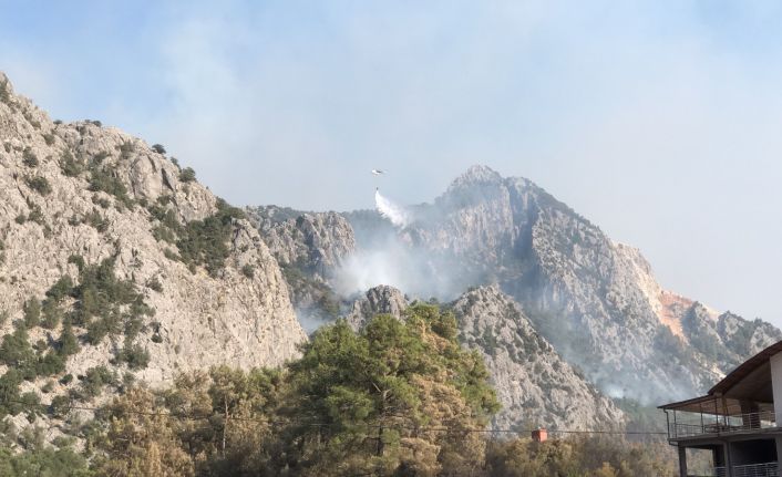 Arazi şartlarının zor olduğu bölgelerde devam eden yangına karadan müdahale zaman zaman zorlaşıyor.