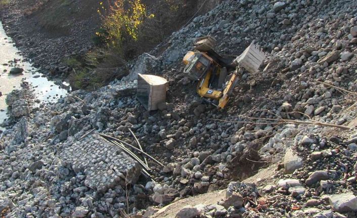 Artvin’de istinat duvarının çökmesi nedeniyle üstünde bulunan iş makinesi toprak altında kaldı.